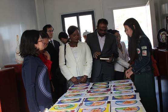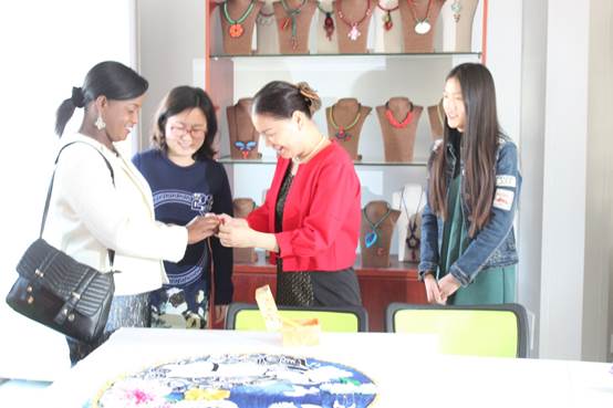 客人一行与女子工坊的师生进行亲切交流,一一参观了各类工艺品,询问有关创业的情况,亲身体验和参与手工制作,并接受女子工坊赠送的友好纪念品。客人对女子工坊的手工艺作品表示赞赏,希望进一步加强友好合作交流。