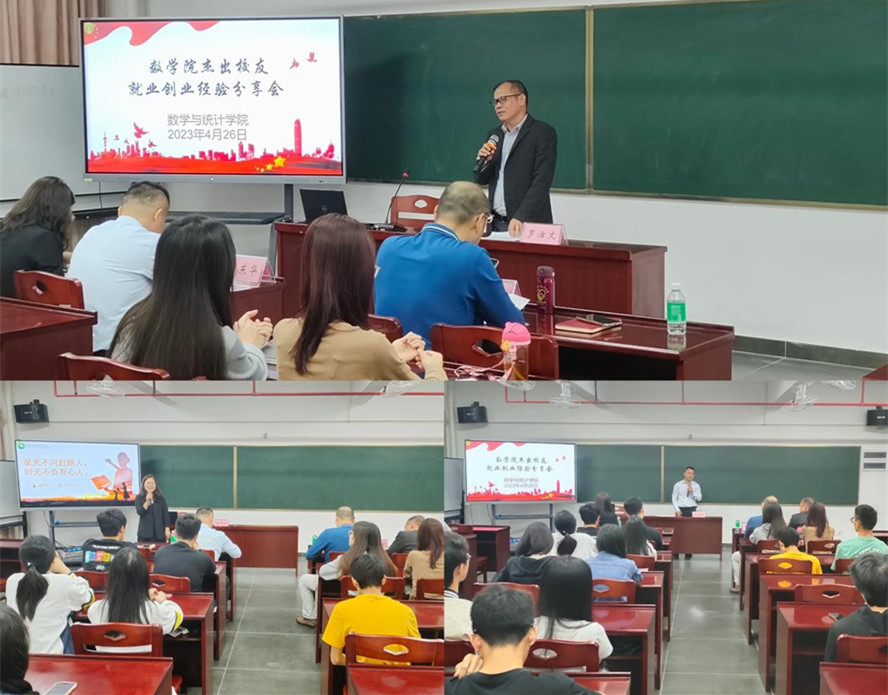 4月26日,数学与统计学院在实训中心214举行以“就业创业经验分享”为主题的交流会,1988届校友、肇庆学院东莞校友会常务副会长、数学院东莞校友会会长罗活文,1995届校友、数学院东莞校友会副会长区东华,2011届校友、东莞市麻涌中学高中数学一级教师潘巧玲出席,分享交流会由学院党委书记杨帆主持。