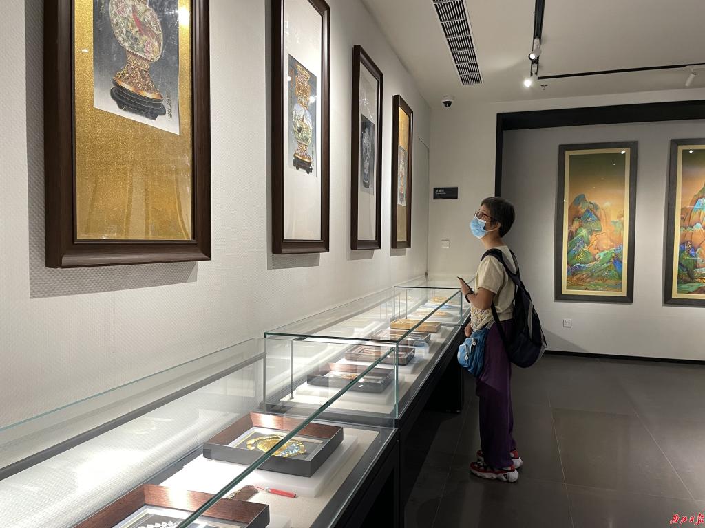 青铜生肖砚、铁骨铮铮傲雪砚、端溪砚坑揽胜图砚……展馆内从墙上到橱窗,分别展示了不同花式及形态的端砚及端砚拓片。无论是直观可见的立体砚石雕刻图景,还是拓印在画纸上的平面画像,都将“画”中美物美景生动呈现。走进展馆另一侧的广府金绣展区,金光熠熠的金绣画作闪耀室内,随着光影的变化而呈现灵动之态,不由吸引观展者驻足打量。